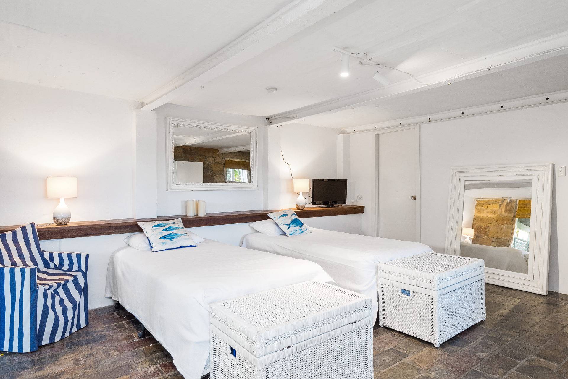 A self-contained studio with external access has twin single beds that can be made into a king bed, bathroom and kitchenette.