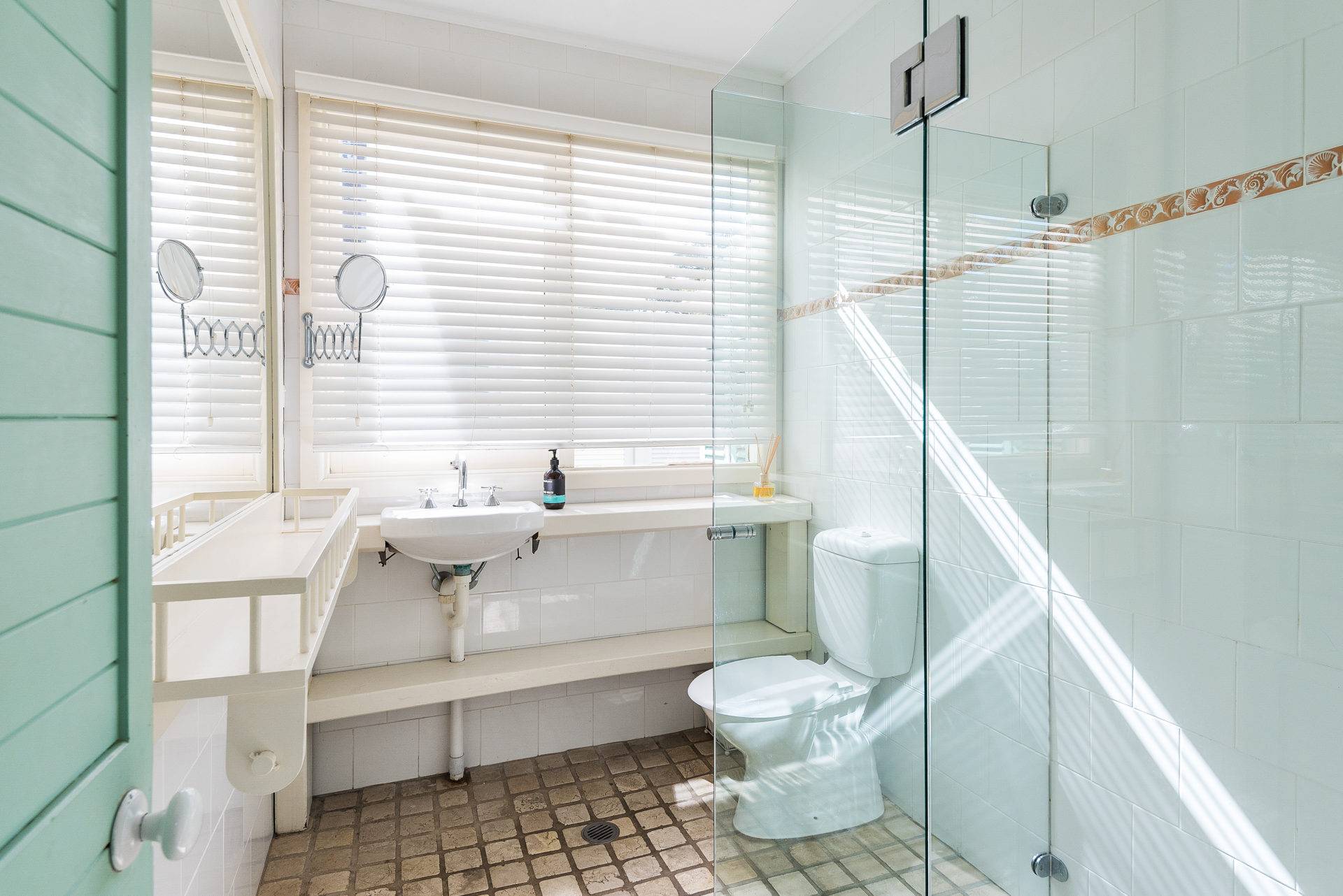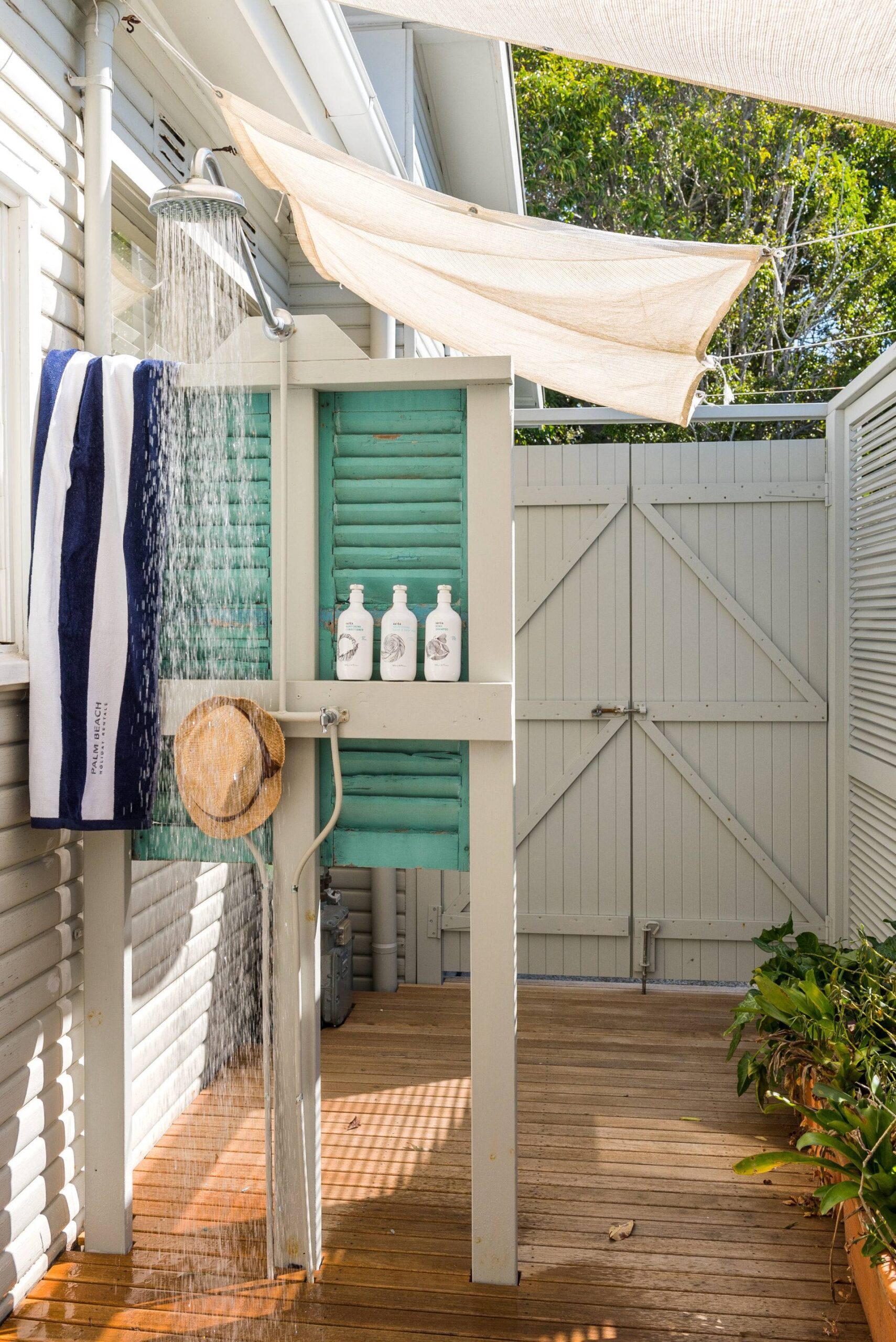 There are two bedrooms on this level, the main with a king bed which can also be twin single beds, the second bedroom with a double bed and a third enclosed sleep out with another double bed. There is also a bathroom, laundry with second loo which opens on to the outdoor shower on this level.