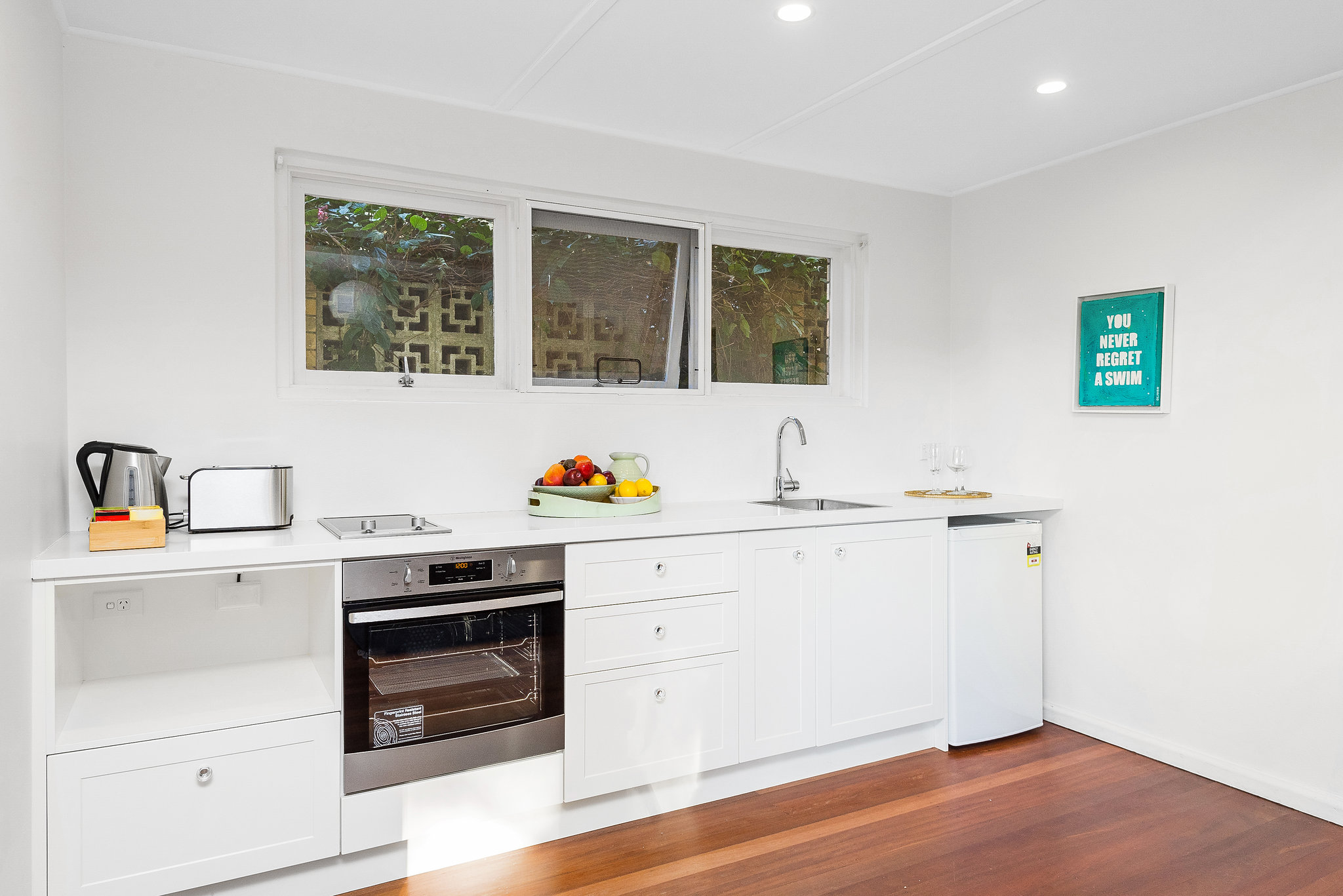 The home is on two levels with the main living, dining and kitchen on the top level and a tranquil balcony perfect to relax on and take in the views after a day on the beach. There are also two bedrooms, both with queen beds on this level plus a bathroom and separate wc. On the lower level there two bedrooms, one with a queen bed and the second with twin singles, each with their own bathroom. There is a second living room with kitchenette opening on to the garden.